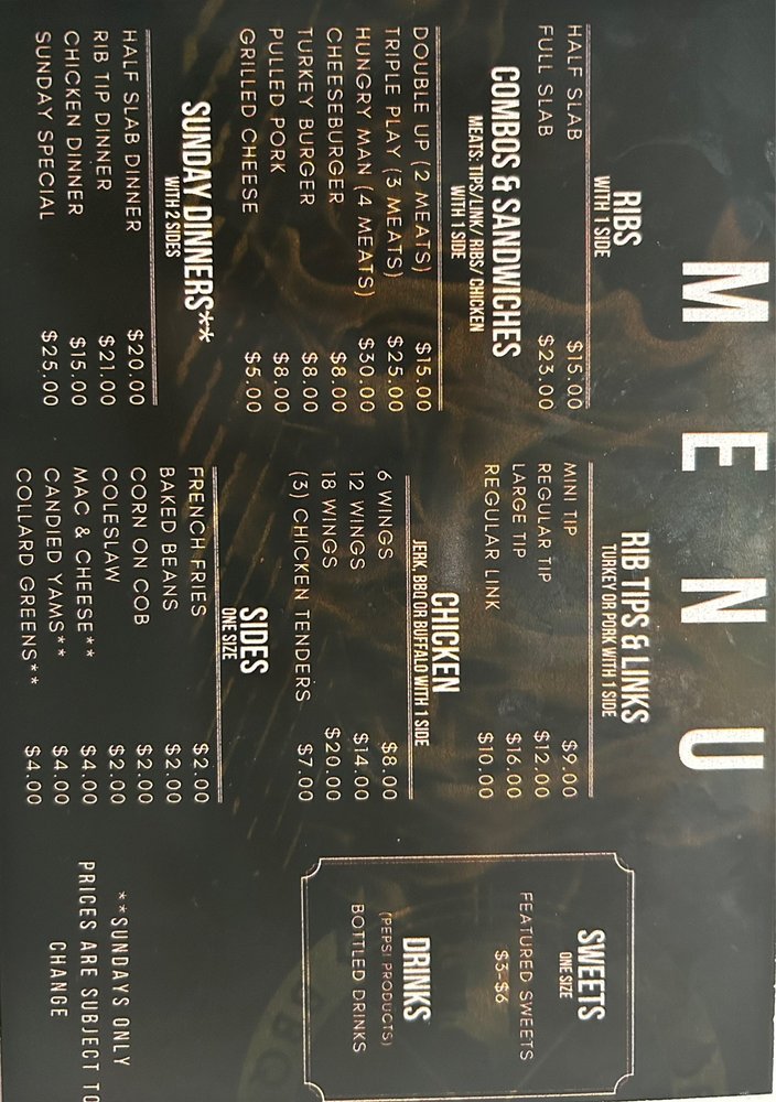 - Half Slab Dinner w/ 2 sides & cornbread on Sundays: $25.00